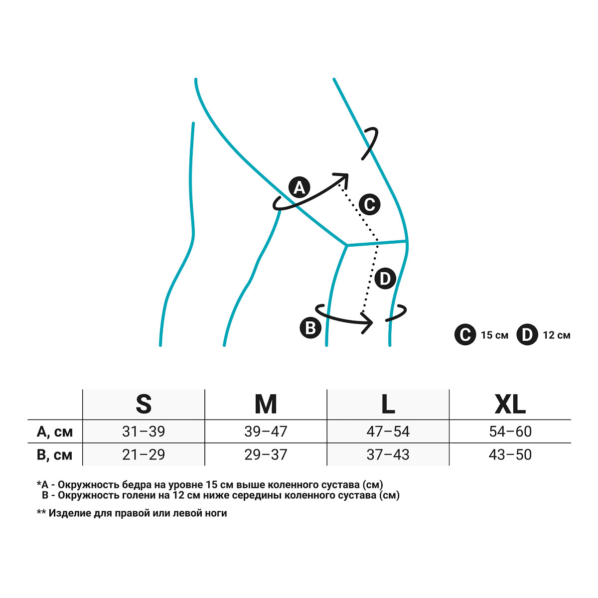 Для подбора ортеза Orlett SO-303 сантиметровой лентой плотно, но не утягивая, измерить окружность бедра на уровне 15 см выше середины коленной чашечки и окружность голени на 12 см ниже середины коленного сустава.