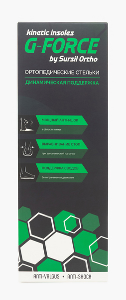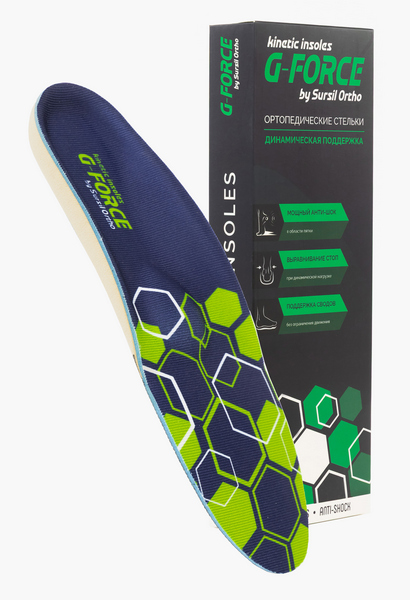 G-FORCE - ортопедические стельки с динамическим каркасом серии KINETIC для поддержки стоп в физиологически правильном состоянии, выравнивания положения стопы, снятия ударной нагрузки в области пятки и облегчения боли, связанной с подошвенным фасциитом (пяточная шпора) и другими патологическими состояниями стоп. Двойная система «анти-шок» особо эффективно помогает снизить болевые ощущения при болях в области пятки.
